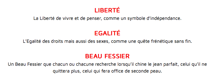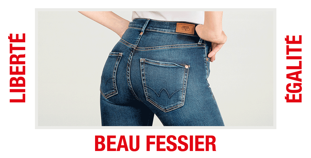 « Liberté, égalité, beau fessier » ; voilà le nouveau slogan inventé par Le Temps des Cerises pour faire vendre des jeans qui feraient un beau cul à toutes les morphologies. Et bien évidemment, ce beau slogan est agrémenté d’une image d’un fessier féminin en (très) gros plan. Pas d’identité, juste des fesses. Et des fesses qui semblent bien loin de promouvoir une supposée diversité morphologique puisque ces fesses n’existent tout simplement pas, comme le mentionne le minuscule « photo retouchée » en dessous.